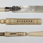A Victorian ivory letter opener and dip pen, the screw fitted pierced and carved tapering handle revealing a gilt metal dip pen with a seal end terminal, length approx 22cm, together with a mother-of-pearl page turner, length approx 17cm.