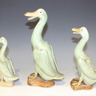 A graduated set of three Chinese celadon glazed figures of standing ducks, Republic period, impressed seal mark to bases, heights approx 16cm, 20cm and 24.5cm.