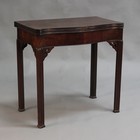 A George III mahogany serpentine front fold-over tea table of small proportions, the hinged top with a moulded edge above a plain frieze with ropetwist beading, the moulded block legs cornered by pierced spandrels, height approx 76cm, width approx 76.