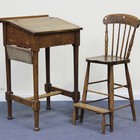 A late Victorian pine school desk with a hinged lid, on turned supports united by a stretcher, together with an elm and ash school high chair, on turned supports.