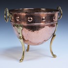 A late 19th Century Arts and Crafts copper and brass mounted circular coal bucket by Henry Loveridge & Co, the planished body with a frieze of roundels and applied brass ring handles, raised on three scroll feet, maker's mark stamped to underside, height approx 32cm.