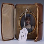 Studio of William and Daniel Downey - Oval Miniature Portrait of Queen Alexandra, watercolour on ivory, signed, approx 7cm x 5.5cm, within a gold frame with foliate engraving, a lock of hair to the reverse, contained within a brown leather case.