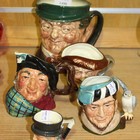 A Royal Doulton mid-sized character jug of 'Mr Pickwick', D5839, two small character jugs, 'The Falconer', D6540, and 'Drake', D6174, a miniature character jug of 'John Peel', D6130 and a Kelsboro 'Auld Mac' jug.