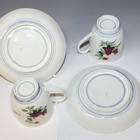 A pair of Worcester porcelain coffee cups and saucers, circa 1770, each painted and gilt with sprays of pink and orange flowers, blue leaves and green stems, as well as blue and red starburst motifs, within underglaze blue double ring borders, total height approx 6.7cm (one cup with minor rim chip).