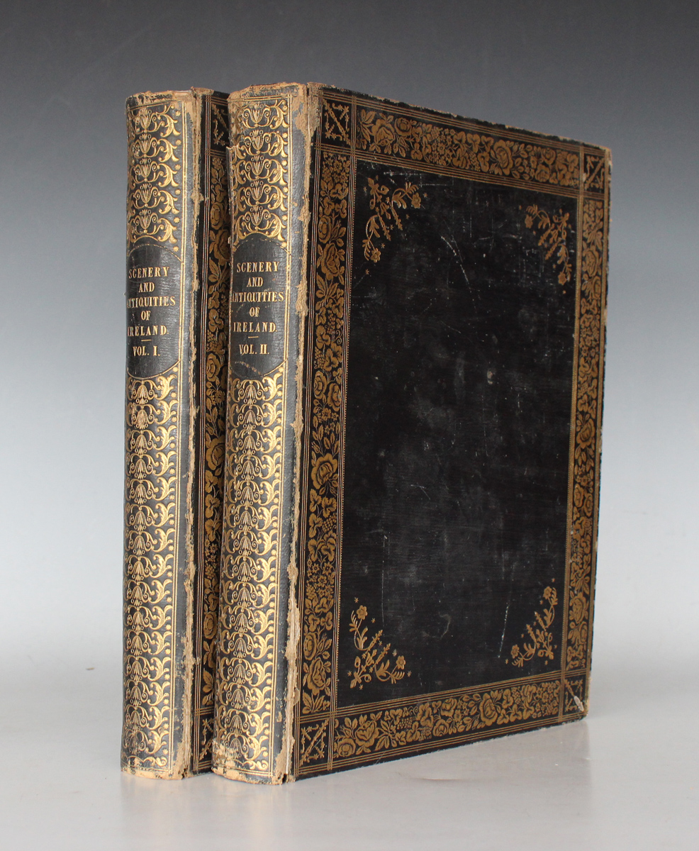 WILLIS, N.P. & J. STIRLING COYNE. The Scenery and Antiquities of Ireland, illustrated from drawings by W.H. Bartlett. London: George Virtue [n.d.] 2 vols., folio (273 x 208mm.) Additional decorative titles, 1 map of Ireland to vol. I, 118 engraved plates. (Light browning, occasional minor spotting or soiling.) Contemporary straight-grain morocco elaborately tooled in gilt, g.e. (extremities lightly bumped, scuffed and rubbed, joints splitting, chipped to head of spine to vol. II).