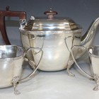 A George V silver three piece tea set, of cut cornered rectangular form with scallop shell and reeded rims, on scallop shell shouldered scroll legs and pad feet, comprising teapot, milk jug and two handled sugar bowl, Sheffield 1926 by Mappin & Webb.