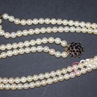 A two row necklace of uniform cultured pearls, on a 9ct gold and sapphire set hexagonal cluster clasp, length of shortest strand approx 35cm.