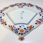 A Japanese Koransha Fukagawa porcelain fan shaped dish, Meiji period, painted and gilt with a figural scene above a ho-o bird panel, underglaze blue mark to base, length approx 27.5cm.