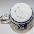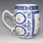 A Chinese blue and white export porcelain tankard, late Qianlong period, painted in the famille rose palette with a panel of insects and flowers, flanked by flower vignettes, within underglaze blue floral borders, height approx 14cm (minor rim chips).