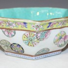 A Chinese famille rose porcelain bowl, mark of Tongzhi and possibly of the period, of steep sided hexagonal form, the exterior enamelled with floral roundels beneath a yellow ground rim filled with flowers and scrolls, turquoise glazed interior and foot, iron red painted seal mark to base, height approx 6cm.