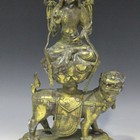 A Chinese gilt bronze figure group, 20th Century, modelled as Guanyin seated on a lotus throne, supported on the back of a Buddhistic lion, standing on a lotus moulded oval base, height approx 46cm.