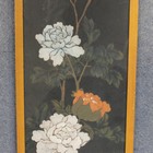 A Chinese painting on silk, early 20th Century, depicting two sparrows flying above peony on a black ground, approx 52cm x 16cm, framed and glazed.
