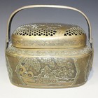 A Chinese polished bronze censer basket and cover, mark of Xuande but late Qing dynasty, the oblong body cast in relief with figural and floral panels against a 'Y' diaper ground, the domed cover pierced and engraved with a maiden carrying fruit beside a crane, butterfly and pine tree, beneath a double hinged overhead handle, incised four character mark to base, length approx 16.5cm.