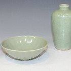 A Chinese celadon glazed vase, the elongated ovoid body carved with peony and scrolling tendrils, height approx 12cm, a celadon glazed bowl and two brown glazed stoneware cylindrical bowls.