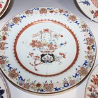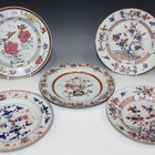 A Chinese famille rose export porcelain plate, Yongzheng period, enamelled with butterflies and peony, diameter approx 23cm, together with three Chinese Imari export porcelain plates, Qianlong period, and another export porcelain plate (some faults).