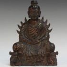 A Chinese Gandhara style gilt lacquered bronze figure of a seated Buddha, 18th/19th Century, the deity with moustache and modelled wearing a long robe, on a plinth base cast with lotus to front flanked by two Buddhistic lion cub corners, traces of gilt and impressed two line inscription to back, height approx 25cm.