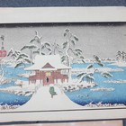 After HIroshige - a Japanese woodblock oban yoyoke print from the series Meisho Setsugekka (snow, moon and flowers at famous places), depicting a snow scene at the shrine of Benzaiten in the pond at Inokashira (Inokashira No Ike Benzaiten No Yashiro Yuki No Kei), approx 20.5cm x 30cm, unframed, together with a small collection of Japanese prints including a standing maiden by Kunisada, all unframed.