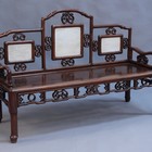 A Chinese rosewood bench, late 19th/early 20th Century, the shaped arched trellis back with three inset marble panels, above a panelled seat and shaped supports, height approx 105cm, length approx 157cm, depth approx 55cm.