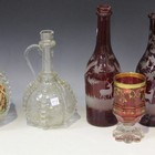 A Dutch glass decanter, late 19th Century, enamelled with boats, windmills, stork and grapes within frill borders, height approx 24cm, together with a similar decanter (cracked), two Bohemian ruby flash decanters and two goblets (some faults).