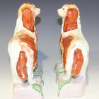 A pair of Staffordshire pottery spaniels, late 19th Century, each with iron red fur decoration and gilt collar, standing on an arched pink base, decorated with green leaves, height approx 19.5cm (hairline to one and minor paint flaking).