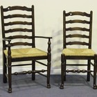 A set of eight 20th Century oak ladder back dining chairs, comprising six standard and two carvers, with rush seats, on turned legs.