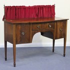 An Edwardian mahogany serpentine fronted sideboard with chequer and line inlaid decoration, fitted with a gilt brass rail above a central drawer flanked by cupboards, on square tapering legs with spade feet, height approx 120cm, width approx 137cm, depth approx 54cm.