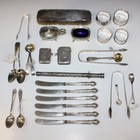 A collection of assorted silver items, including two vesta cases, Chester 1901 and 1904, a cylindrical table lighter, London 1895 by Samuel Jacob (one hinge lid missing), four napkin rings, three pairs of sugar tongs and cutlery, together with a small collection of plated spoons.