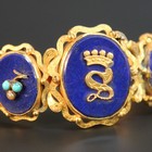 A gold, lapis lazuli, seed pearl and imitation turquoise set oval hinged bangle, the front with a coronet above an 'S' motif on a lapis lazuli ground, between two smaller oval lapis lazuli set sides, engraved at the back 'Given by Lady Ravensworth to Louisa Barrington on her marriage 3rd July 1845 left by her to Augusta Maclagan 17th June 1884', inside diameter approx 5.8cm.
