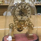 A late 19th Century brass skeleton timepiece with single fusee movement, the pierced silvered chapter ring with applied gilt Roman numerals, the frame of pierced scroll design on rectangular plinth supports, height approx 41.5cm, with pendulum and winding key, on an ebonized oval base with glass dome (some alterations and restoration).