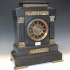 A late 19th Century cast brass mounted slate mantel clock with eight day movement striking on a gong, the circular dial with gilt Roman numerals, the case of architectural form with two panels decorated with frolicking putti, on bracket feet, height approx 42cm.