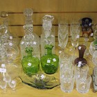 A collection of assorted glassware including a pair of dimpled green glass ewers and stoppers, eleven decanters and stoppers and a Mappin & Webb plated six bottle cruet.