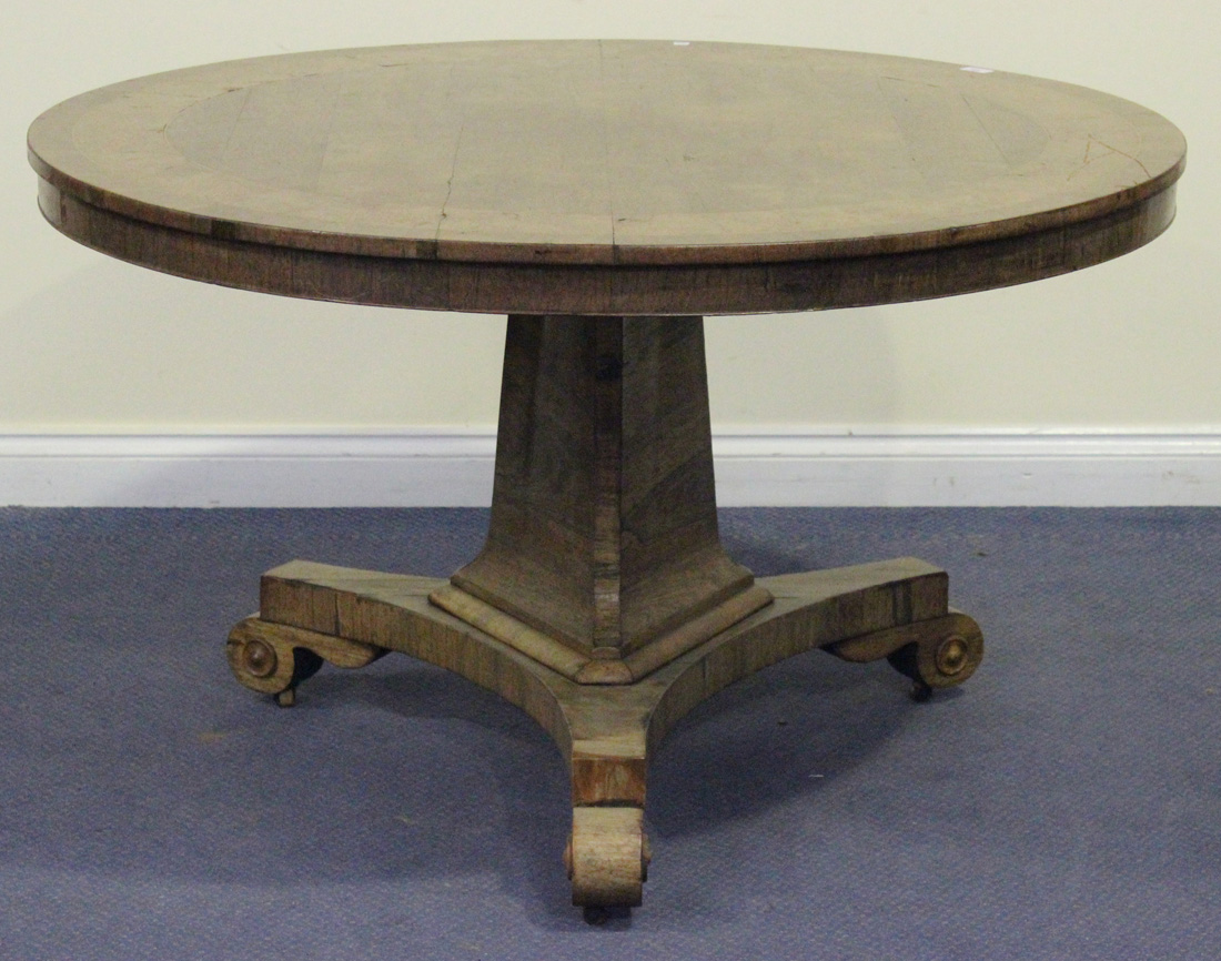 A William IV rosewood circular tip-top breakfast table, the top with a wide pollard oak crossbanded border, the flared pedestal on a triform base with scroll feet and castors, height approx 72cm, diameter approx 129cm (faded). Provenance: from the principal contents of Wephurst Park, Wisborough Green.