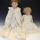 An Armand Marseille bisque head doll, impressed '990 A12M', with blonde wig, closing blue eyes, open mouth showing upper teeth and bent limb composition body, height approx 60cm, clothed, together with an Armand Marseille bisque head Dream Baby doll, a Heubach Köppelsdorf bisque head doll, impressed '300.0', with later brown wig, closing blue eyes, open mouth showing upper teeth and quivering tongue, and composition bent limb body, height approx 40cm, and six other bisque head dolls with composition bodies, all clothed (some playwear and faults).