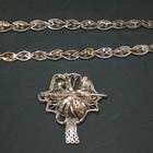 A diamond set pendant necklace, the detachable front in a pierced openwork floral design, with a brooch fitting to the back, width approx 5.2cm, flanked by two similar detachable chains in a foliate design, each forming a bracelet, length of each chain approx 21cm.