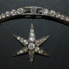 A late Victorian diamond set brooch, designed as a six pointed starburst and a shallow crescent, mounted with cushion shaped diamonds, width approx 9.5cm (starburst detached from crescent and one diamond lacking).