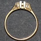 A gold, platinum, sapphire and diamond three stone ring, claw set with the rectangular step cut sapphire between two circular cut diamonds, detailed '18ct plat', ring size approx N1/2.