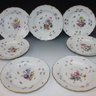 A Meissen porcelain part service, late 19th/early 20th Century, painted with flower sprays, scattered insects and floral sprigs within a spiral moulded basket weave and lattice rim, comprising a two handled sauce boat with integral stand, nine dessert plates, five side plates, and six soup bowls, crossed swords in underglaze blue to bases (chip to rim of one dessert plate and chips to foot of one dessert plate).