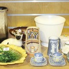 A Continental majolica dish, late 19th/early 20th Century, modelled as a leaf with branch handle and three acorns, impressed '18' to base, length approx 31cm, together with a group of ceramics, including a pair of Thoune pottery cups and saucers, a Ewenny vase and a Gerbino Vallauris Mosaic posy vase (minor faults).