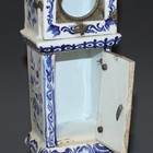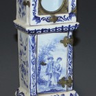 A Dutch Delft blue and white watch stand, late 19th/early 20th Century, modelled as a longcase clock, painted with figures, landscapes and flowers, painted 'R' over '3' to base, height approx 30.5cm.