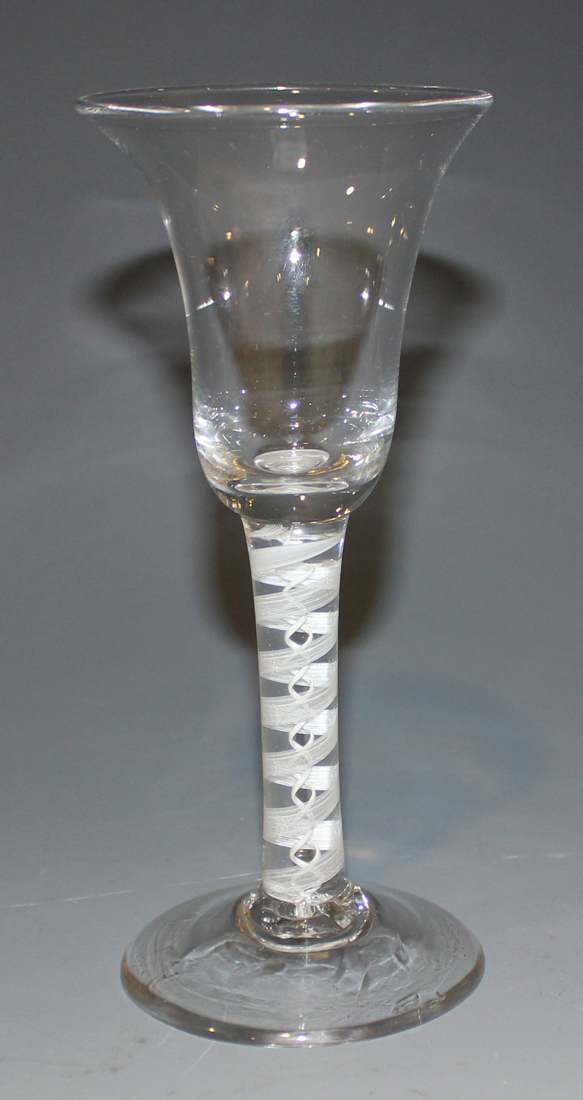 A wine glass, mid-18th Century, with bell shaped bowl, the double series opaque twist stem with eighteen ply spiral band outside a pair of spiral threads, on a conical foot, height approx 16.5cm.