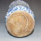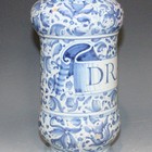 An Italian blue and white maiolica albarello, 17th/18th Century, possibly Faenza, labelled 'Dracvlvs', within borders on blue leaves on a pale berretino ground, height approx 24cm (minor rim chips).