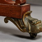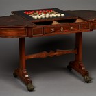 A Regency rosewood backgammon and chess sofa table, attributed to Gillows of Lancaster, the reversible sliding top inlaid with a chess board within a border of gilt-tooled blue morocco leather, the interior with a velvet-lined backgammon board, each curved end with a hinged lid, the frieze with applied gilt metal anthemion escutcheons and six-point star handle plates within beaded borders, the twin pedestal end supports united by a shaped stretcher, terminating in gilt cast bronze scrolling claw feet and brass castors, height approx 73.5cm, length approx 139cm, depth approx 61.5cm. Note: illustrations of very similar tables can be seen on pages 265 and 267 in Volume I of 'Gillows of Lancaster and London 1730-1840' by Susan E. Stuart.