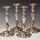 A set of four George II cast silver Rococo candlesticks, with detachable cast foliate scroll edged nozzles, each shell moulded sconce on a waisted baluster stem with scroll shoulder, the base cast with scrolls and leaves framing an engraved armorial, London 1751 and 1752 by Alexander Johnston, height approx 27cm, each numbered 1-4 and scratch weights incised to bases.