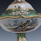 An H & R Daniel porcelain ornithological Chelsea shape dessert service, circa 1845, each piece painted with a study of a bird within a scroll moulded green border filled with fruit and flower vignettes, embellished with gilt framing, comprising twenty-five plates, a centrepiece, four comports, three oval dishes, three rectangular dishes and a pair of cream tureens and covers, painted pattern number '8224' to bases (faults).