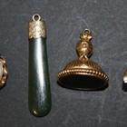 A 9ct gold mounted bloodstone set pendant seal, a gold mounted cornelian set seal, a 9ct gold mounted pendant compass and a gold mounted nephrite jade pendant.