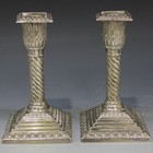 A pair of late Victorian silver candlesticks, each detachable square nozzle above an acanthus leaf sconce and spiral reeded stem, on a stepped square base, Sheffield 1893 by Walker & Hall, height approx 15cm.