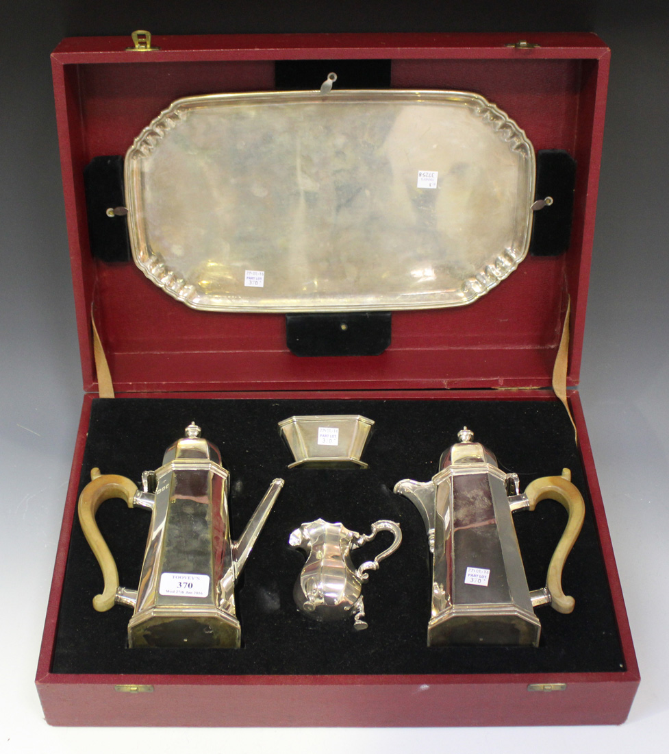 A George I style silver harlequin five-piece coffee set, of octagonal form, comprising coffee pot, hot water jug, sugar bowl and tray, London 1933, 1936 and 1938 by D & J Wellby Ltd, and a cream jug, London 1935 by J. Parkes & Co, cased.