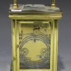A late 19th/early 20th Century brass carriage clock with eight day movement striking on a gong, the white enamel dial with red Roman numerals and decorated with floral garlands, the glazed case with a swing carrying handle, on a plinth base with bracket feet, height approx 14.5cm, with a key (faults).