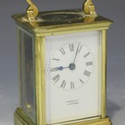 A late 19th/early 20th Century lacquered brass carriage timepiece, the enamel dial with Roman numerals and inscribed 'Russells Ltd, Liverpool', the glazed case with swing handle on bracket feet, height approx 14.5cm, with winding key.