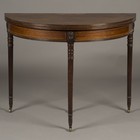 An early 19th Century rosewood demi-lune fold-over card table with boxwood and ebony stringing, the hinged top with an inlaid and penwork fan patera, raised on reeded tapering legs terminating in brass caps and castors, height approx 71cm, width approx 92cm.
